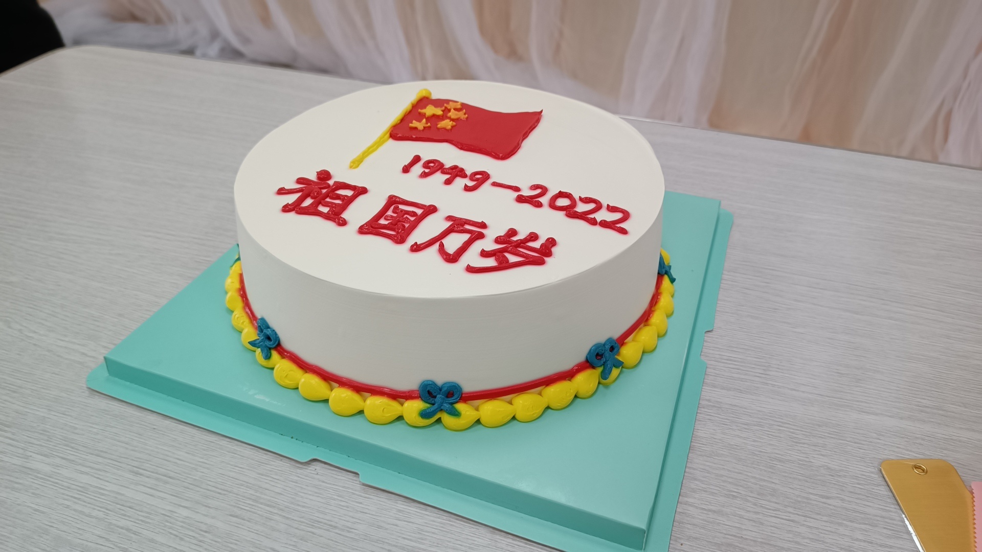 活動現(xiàn)場為祖國母親準(zhǔn)備了生日蛋糕,并邀請現(xiàn)場年紀(jì)最大的長者來切。